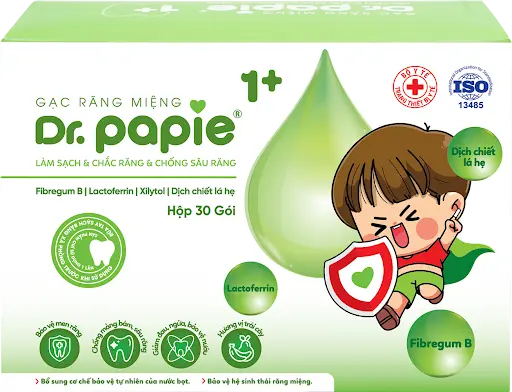 Gạc răng miệng Dr.Papie là trang thiết bị y tế loại A. Gạc được tẩm sẵn dịch có tác dụng kháng khuẩn, chống nấm để trị tưa lưỡi cho bé. Sản phẩm đặc biệt phù hợp cho trẻ em và trẻ sơ sinh. Đã được Bộ Y Tế công nhận có vai trò ngăn ngừa, hỗ trợ điều trị nấm miệng cho trẻ.