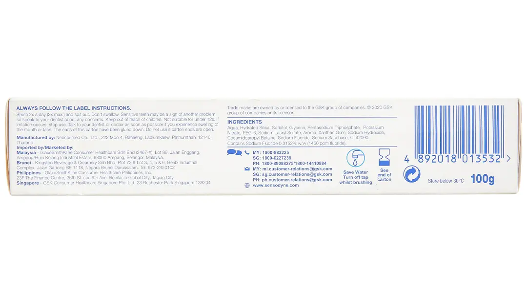 Aqua, Hydrated Silica, Sorbitol, Glycerin, Pentasodium Triphosphate, Potassium Nitrate, PEG-6, Sodium Lauryl Sulfate, Aroma, Xanthan Gum, Sodium Hydroxide, Cocamidopropyl Betaine, Sodium Fluoride, Sodium Saccharin, CI 42090. Contains Sodium Fluoride 0.3152% w/w (1450 ppm fluoride).