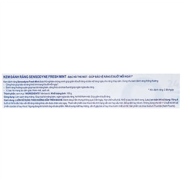 Kem đánh răng Sensodyne Fresh Mint hỗ trợ làm dịu cảm giác ê buốt và bảo vệ răng khỏi hiện tượng ê buốt, ngăn ngừa tình trạng mảng bám và sâu răng, có hương bạc hà tươi mới giữ cho khoang miệng luôn sạch sẽ và thơm mát.