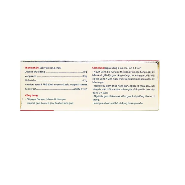 Hamega là dòng sản phẩm hỗ trợ tăng cường sức khỏe dành cho người bị suy giảm chức năng gan, người có men gan cao. Thành phần của Hamega được chiết xuất từ những vị thuốc tự nhiên như diệp hạ châu đắng, nhân trần, vọng cách… Do đó, sản phẩm an toàn, lành tính và bạn có thể yên tâm sử dụng lâu dài.