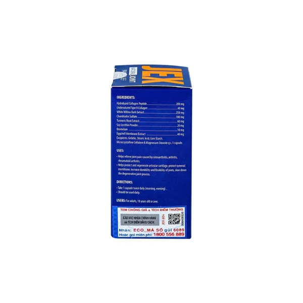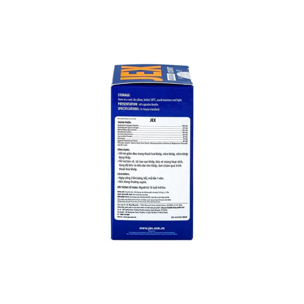 JEX 60 viên chứa Collagen Peptide và các tinh chất quý từ thiên nhiên (White Willow Bark, Chondroitin Sulfate, Turmeric...), giúp giảm đau, tăng cường tái tạo sụn khớp và phần xương dưới sụn, tăng độ bền và dẻo dai cho khớp. Sản phẩm được sản xuất tại Mỹ.