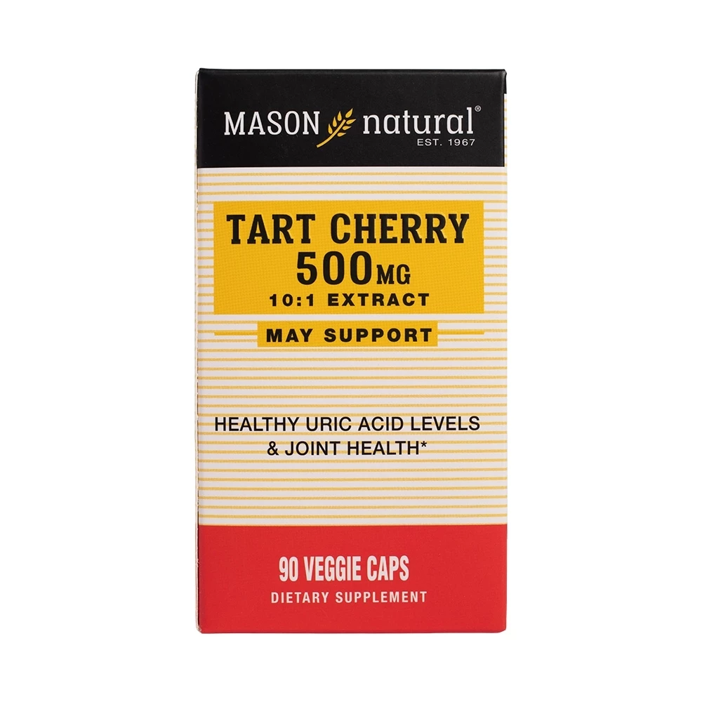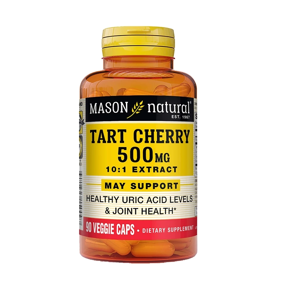 Mason Natural Tart Cherry 500mg chứa chiết xuất anh đào chua, chiết xuất hạt nho và chiết xuất hạt cần tây cung cấp các chất chống oxy hóa tự nhiên giúp cân bằng nồng độ acid uric trong cơ thể. Hỗ trợ giảm viêm, sưng đau các khớp và nguy cơ bùng phát bệnh gout. Bên cạnh đó, viên uống không chứa đường, men, lúa mì, sữa, gluten, cá, hạt cây, đậu phộng, trứng, hương thơm, màu hoặc hương vị nhân tạo, chất bảo quản, sản phẩm động vật và động vật có vỏ giáp xác an toàn cho người bệnh gout bị dị ứng với các thành phần nêu trên.