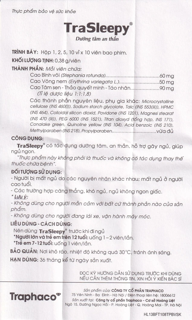 Sản phẩm TraSleepy có chứa các thành phần tự nhiên như táo nhân, lá vông, củ bình,... có tác dụng ức chế lên hệ thần kinh trung ương, giúp an thần và mang lại giấc ngủ tự nhiên cải thiện chất lượng của giấc ngủ trong các trường hợp mất ngủ do nhiều nguyên nhấc khác như ngủ không ngon, khó ngủ, giấc ngủ không sâu, ngủ không đủ giấc.