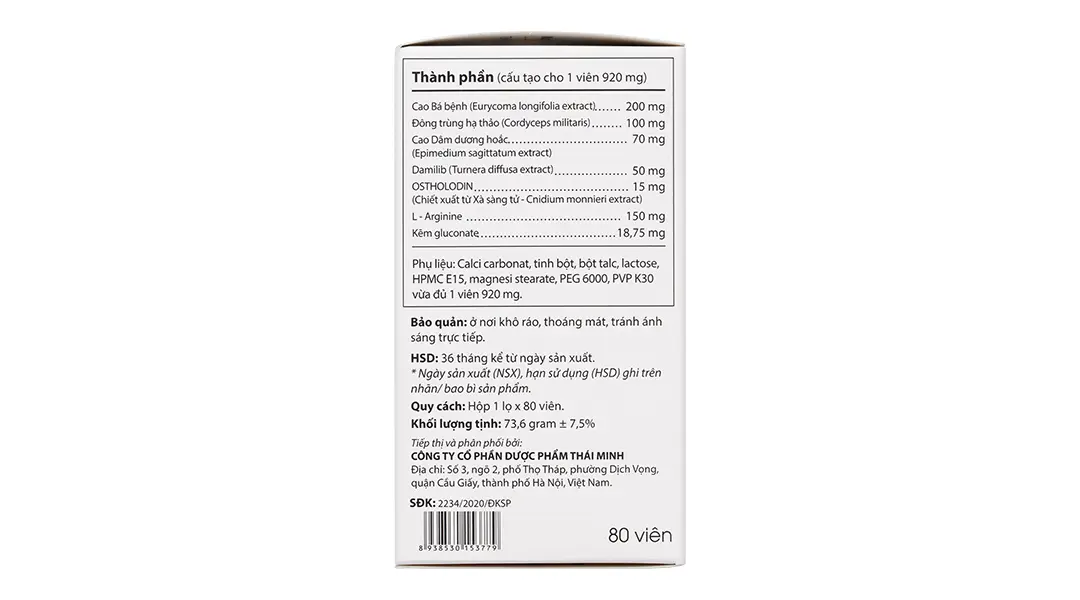 Phụ liệu: Calci carbonat, Tinh bột, Bột Talc, Lactose, HPMC E15, Magnesi Stearate, PEG 6000, PVP K30 vừa đủ 1 viên 920mg