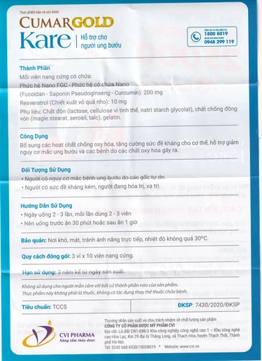 Cumargold Kare là thực phẩm bảo vệ sức khỏe hỗ trợ tăng cường miễn dịch và nâng cao thể trạng, giảm mệt mỏi đồng thời hỗ trợ giảm tác dụng phụ của hóa xạ trị. Cumargold Kare là sản phẩm duy nhất được Unesco vinh danh và Bộ Khoa Học Công Nghệ cấp bằng sáng chế.