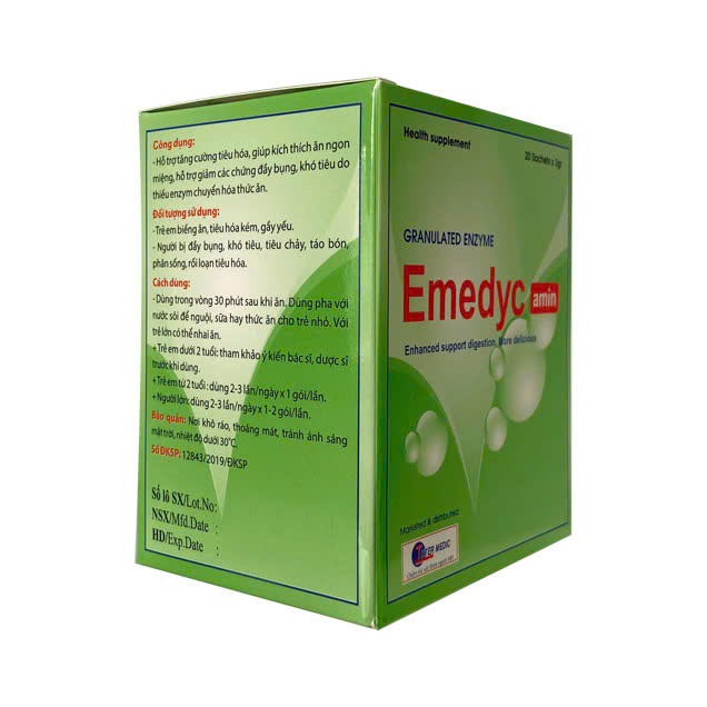 - Hoạt chất: Mỗi gói cốm Emedyc amin 3g gồm: Enzyme Amylase 85Ul, Enzym Protease 40UI, Enzyme Maltase 40UI, Bột acid amin 50mg, Vitamin B1 0,5mg, Vitamin B2 0,5mg, Vitamin B5 2,0mg, Vitamin B6 0,5mg, Vitamin B9 150mcg
