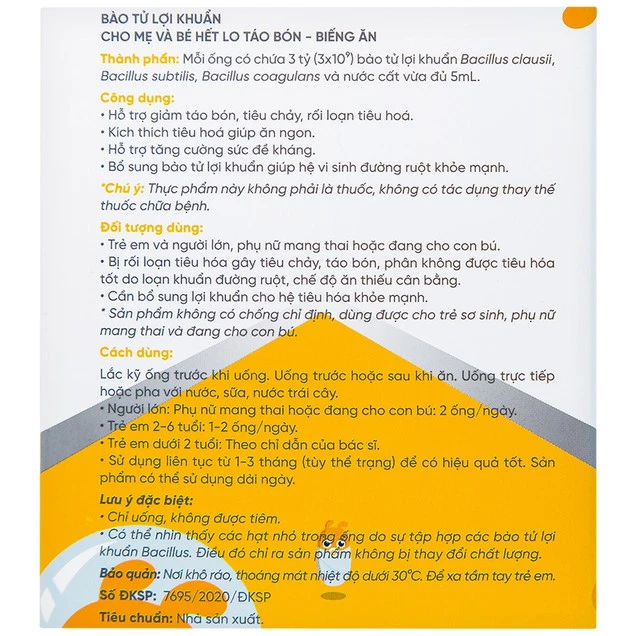 - Bổ sung bào tử lợi khuẩn giúp hệ vi sinh đường ruột khỏe mạnh.