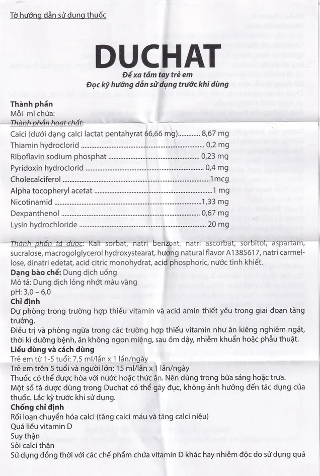 Thuốc Duchat chứa lysin bổ sung dinh dưỡng thiết yếu cho trẻ em và thanh thiếu niên trong độ tuổi phát triển. Thuốc cũng được chỉ định là một sản phẩm bổ sung dinh dưỡng trong thời gian dưỡng bệnh cũng như cho chế độ ăn đặc biệt.